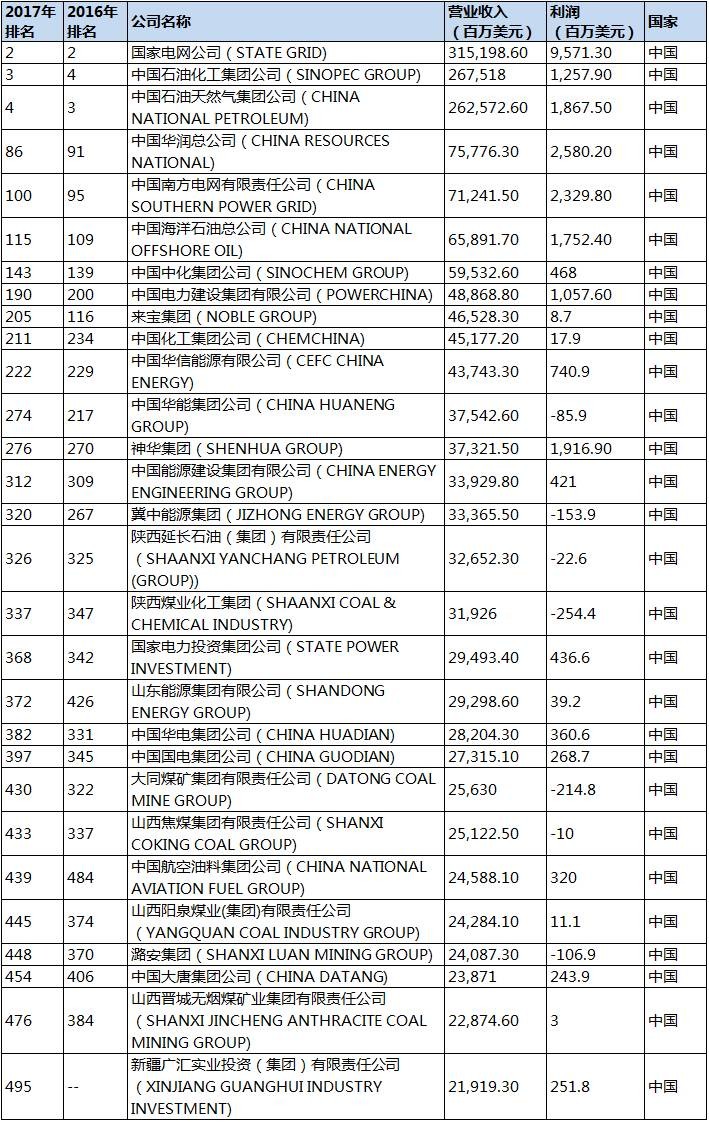 在能源企业中,两大电网国网和南网分别以315198.6百万美元和71241.5百万美元的营业收入排名第2位和第100位。三大石油中石化、中石油和中海油分别位列第3、第4和第115,营业收入分别为267518百万美元、262572.6百万美元和65891.7百万美元。五大发电集团华能、国家电投、华电、国电和大唐排名分别为第274位、第368位、第382位、第397位和第454位。神华集团、陕煤集团、大同煤矿、山西焦煤集团、山西阳泉煤业以及潞安集团等煤炭企业也纷纷位列榜内。