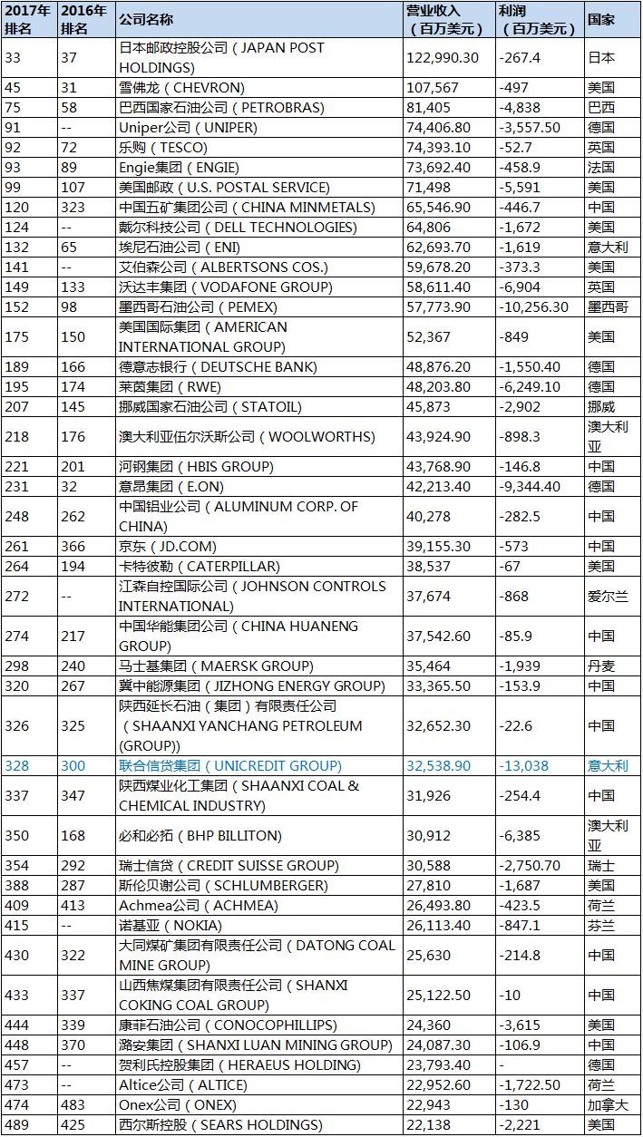 尽管《财富》世界500强企业榜单被广泛认可,但这个榜单仅仅是以营业收入排名,未将企业利润考虑在内,甚至有多家企业利润为负值。在2017年的榜单中,利润为负的企业有43家,其中亏损最为严重的是排名第328位的意大利企业联合信贷集团,共亏损13038百万美元。