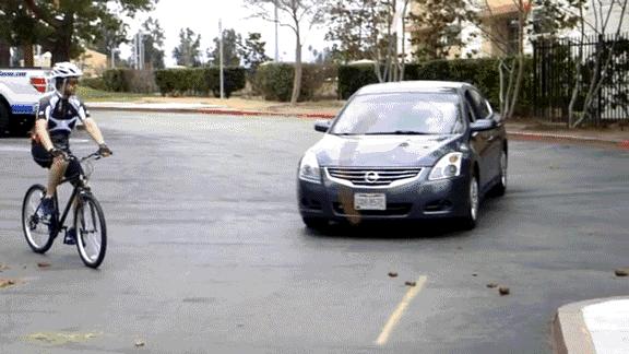 骑车男不知马路危险,戴着耳机横冲直撞,突然前面一辆日产开过来,由于喇叭声响超过周遭声音,所以骑单车男也在耳机里及时听到了喇叭鸣笛。