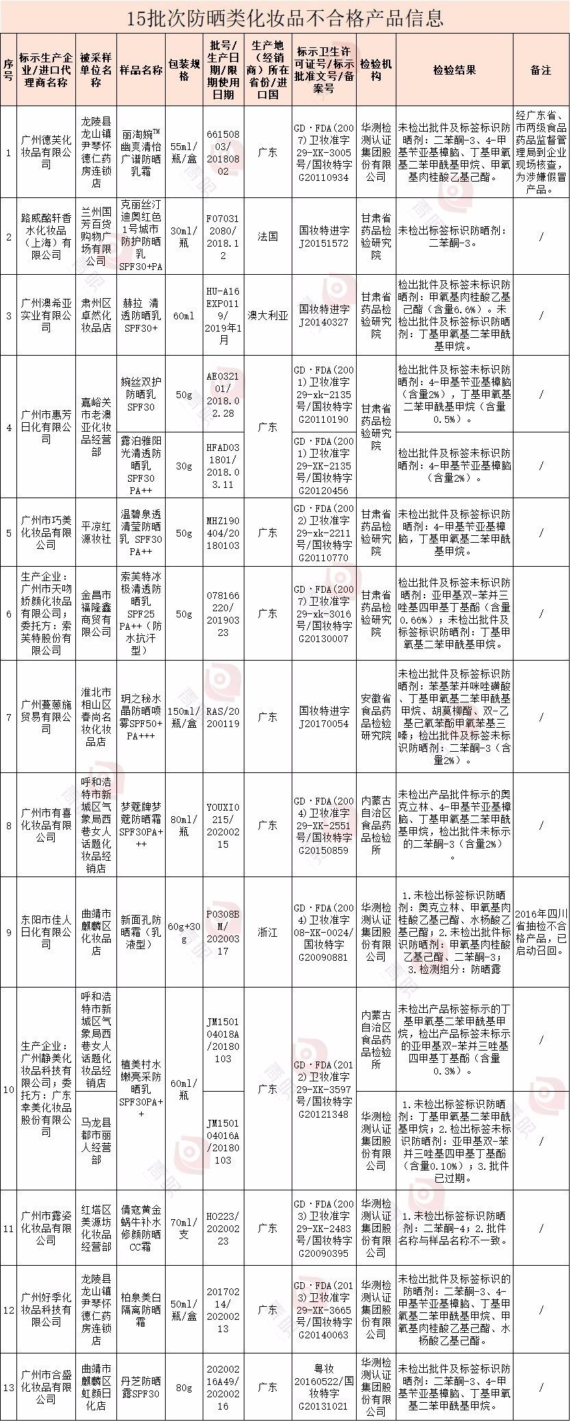 其中,1批次广州德芙化妆品有限公司丽淘婉幽爽清怡广谱防晒乳霜经核查为涉嫌假冒;在云南抽检的问题产品——新面孔防晒霜,2016年已在四川省抽检不合格产品,并启动召回。