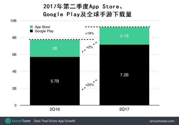 就下载量而言,Google Play第二季度的手游下载量约为72亿人次,较去年同期的57亿人次增长25%;这一增长率远远高于苹果App Store同期2%的手游下载量增长率。