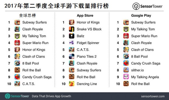 除了《王者荣耀》之外,App Store平台下载量最高的手游还有:Voodoo的《贪吃蛇大战方块》、《Ballz》和育碧的《Fidget Spinner》等。除了《地铁跑酷》之外,Google Play平台下载量最高的手游还有:《会说话的汤姆猫》、《超级马里奥跑酷》和《部落冲突皇室战争》等。