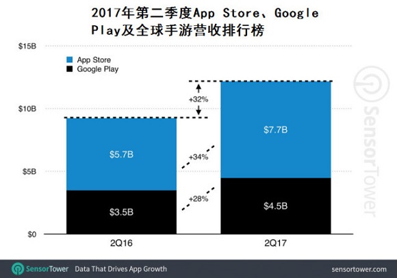 苹果App Store第二季度的手游毛收入大约为77亿美元,较去年同期的57亿美元增长34%。同期谷歌Google Play手游毛收入约为45亿美元,较去年同期的35亿美元增长28%。