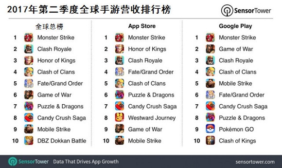 就营收而言,Mixi的《怪物弹珠》继续蝉联App Store、Google Play和全球排行榜榜首。其中,《王者荣耀》的上升势头最为明显,这款手游在所有手游营收排行榜上的位次由上一季度的第7位上升到第3位,在App Store营收排行榜上的位次由上一季度的第3位上升到第2位。