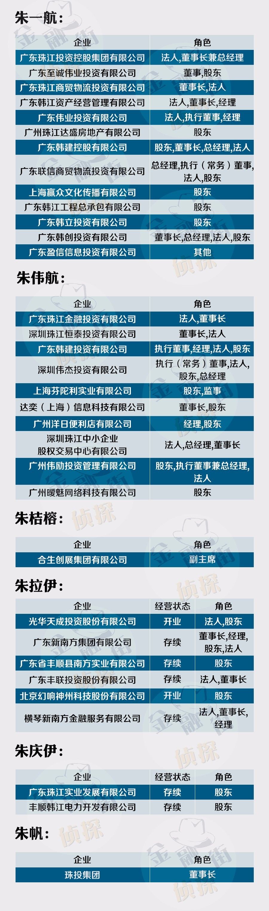 朱氏三兄弟中,毕业于广州医科大学的朱拉伊创办了邓老凉茶,其主管的广东新南方集团,目前以中医药产业为发展重心。三弟朱庆伊创办的珠光控股,也在十年前在香港借壳上市。朱孟依的妹夫何国华、妹妹朱帆还分别掌管过广东珠江投资股份公司和广东珠江投资管理集团有限公司。
