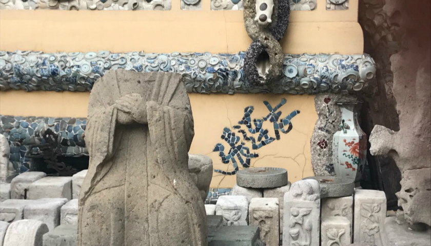 按照官方介绍,“瓷房子”建造历经14余年,到目前为止已用掉7亿多片古瓷片、13000多个古瓷瓶、4000多件古瓷盘和碗、20多吨水晶石与玛瑙、以及数以千计的历代石雕造像、汉白玉石雕等。这些几乎涵盖了中国古代各个历史时期的瓷器,都被用水泥内部浇注,并用大理石胶粘连固定成为建筑的一部分。