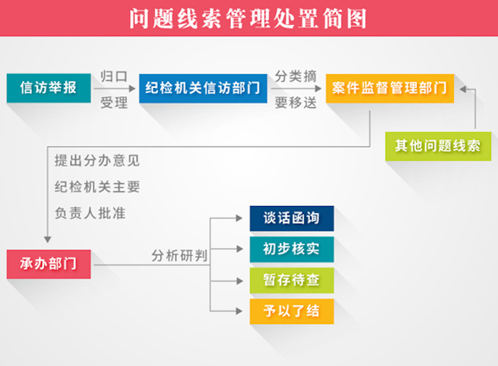 严格的规范从执纪审查工作的起点——接收问题线索开始。二室指定专人负责接收、管理问题线索,逐件编号登记、建立管理台账。之后,经室主任、分管副主任审批后分送各联系处分析研判。按照《工作规则》,问题线索有四类处置方式:谈话函询、初步核实、暂存待查、予以了结。