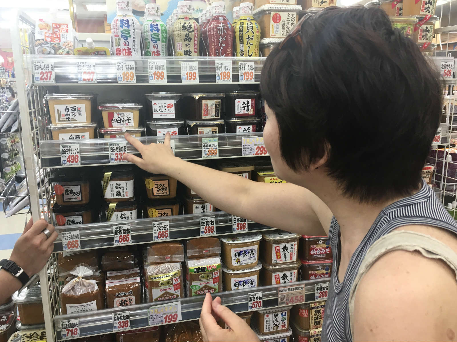 “这个固体的东西是味增,黄豆酿成的。日本的味增分为很多种,颜色越深口味越浓重。我们今天会用到这个深色的,但是我会把白色的也买回去,让你们尝尝……”Yukari说道,接着她走到冷藏柜前拿起一盒片好的三文鱼,“好了,今天就这么多。”
