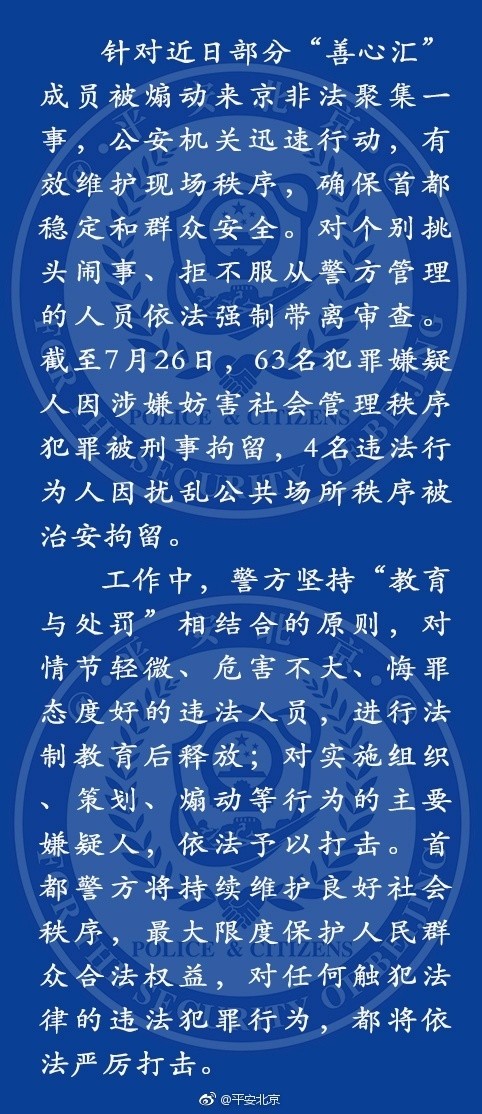 北京市公安局今晚在官方微博发布通报,称“善心汇”63名犯罪嫌疑人被刑事拘留,4名违法行为人被治安拘留。针对近日部分“善心汇”成员被煽动来京非法聚集一事,公安机关迅速行动,有效维护现场秩序。对个别挑头闹事、拒不服从警方管理的人员强制带离审查。截至7月26日,63名犯罪嫌疑人因妨害社会管理秩序犯罪被刑事拘留,4名违法行为人因扰乱公共场所秩序被治安拘留。