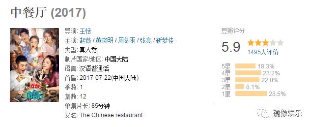 《中餐厅》是湖南卫视推出的经营体验类美食综艺节目,邀请常驻嘉宾赵薇、黄晓明、周冬雨、张亮、靳梦佳,每期邀请其他嘉宾作为帮工出现,共同经营餐厅。这也是赵薇参与的首档真人秀节目。虽然收视和播放量不错,但豆瓣评分仅5.9,离及格还差了点,与《十二道锋味》的7分相比也有一定差距。