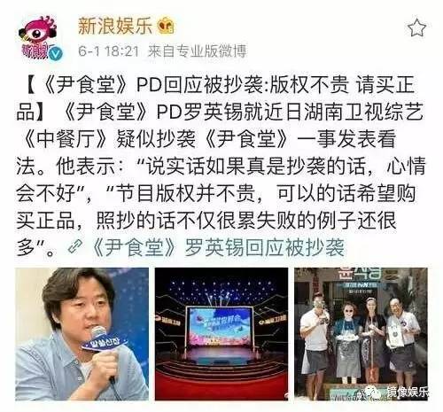 关于湖南卫视《中餐厅》抄袭韩国《尹食堂》的言论,湖南卫视官方还没有任何回应,但《尹餐厅》的导演已经回应了:“说实话如果真是抄袭的话,心情会不好……节目版权并不贵,可以的话希望购买正品,照抄的话不仅很累失败的例子还很多。”