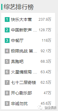 美食类综艺虽然数量大,但收视平平,《中餐厅》上线虽然伴随着抄袭风波,但也交出了收视四网第一,播放1亿的不错答卷。