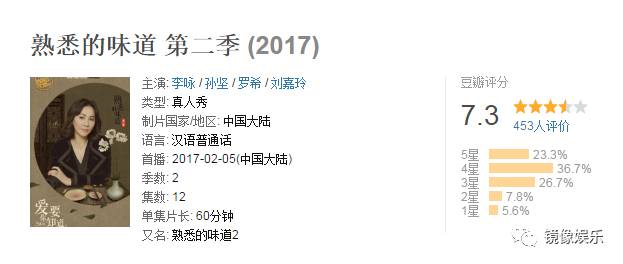 同为浙江卫视推出的美食综艺《熟悉的味道》由李咏主持,主打明星+感恩,在豆瓣拿到7.3分。第一季节目中的十位明星分别是:汤唯、冯小刚、李云迪、刘翔、李宇春、林志颖、邓紫棋、王宝强、张静初、海清,堪称电影级别的阵容。即便如此,腾讯视频两季的播放量分别为2.53亿和1.11亿,呈明显下滑的趋势。