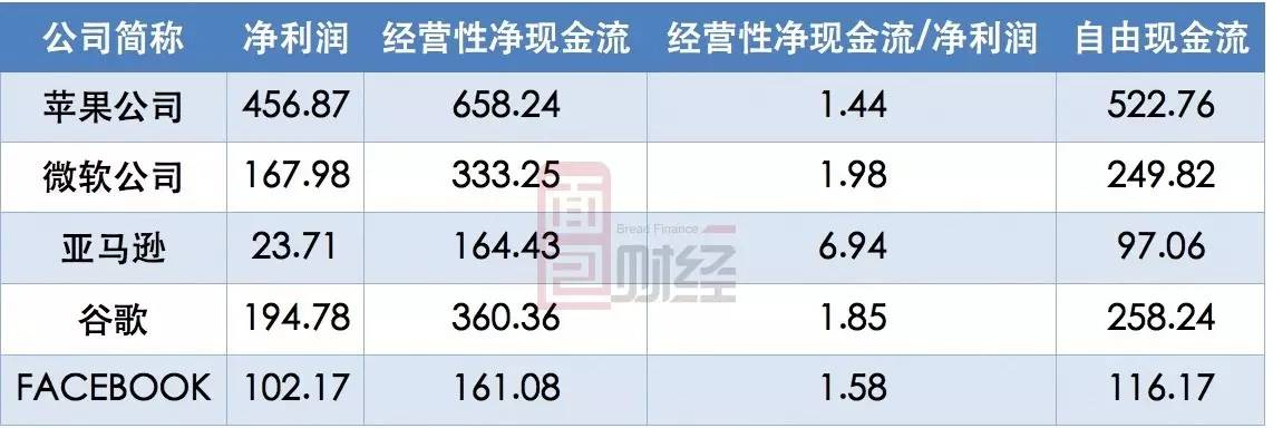 除了手持巨额现金外,FAAMG的净利润含金量也高。下图为面包财经绘制的FAAMG在2016年的现金流情况表(单位:亿美元):