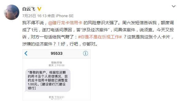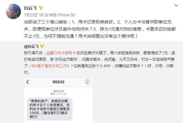 25日,微博名为白云飞的认证用户发布微博称,22日收到了来自建行信用卡的短信,被告知个人建行信用卡的额度被调整至1元,建设银行官方给出的理由为“涉及经济案件”。