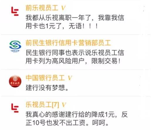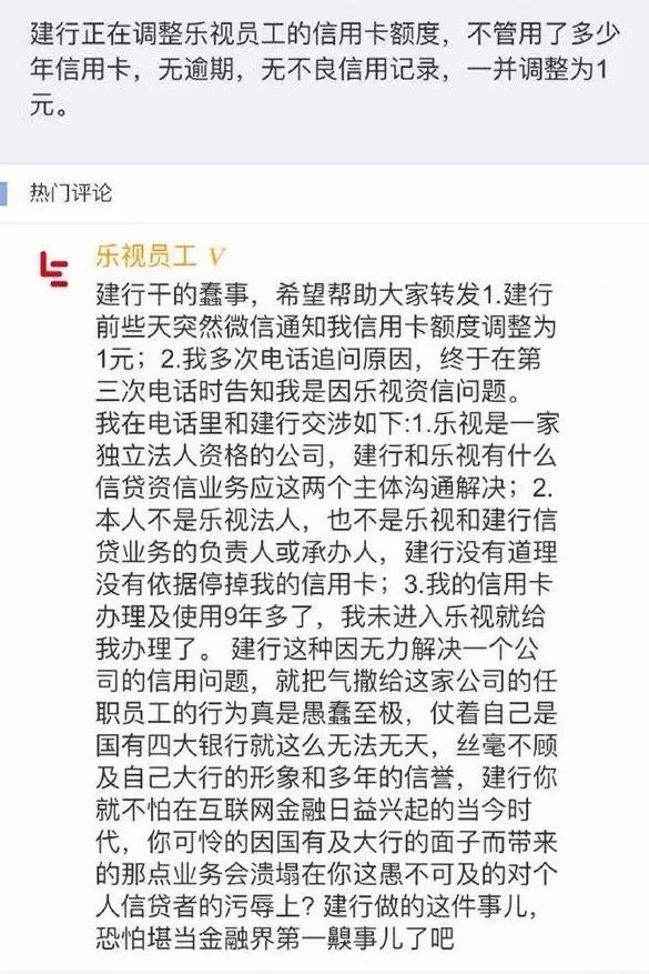 一则“建行将乐视员工的信用卡额度降至1元钱”的消息以及“你是不是在乐视工作?”的话题,刷爆了社交圈。