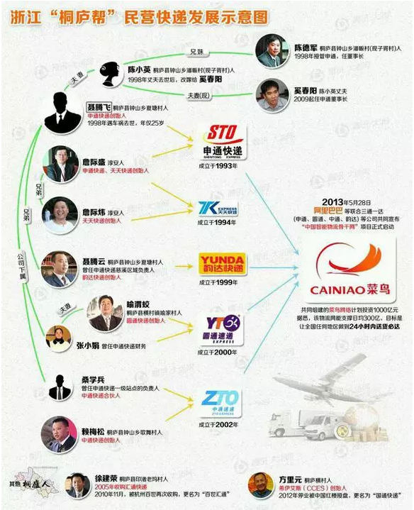 盛传颇广的故事是,聂腾飞、詹际盛在1993年双双从工厂辞工,创办了后来的“申通快递”,成为国内第一家民营特许加盟的快递企业。风云际会,沧海横流,在复杂的人际关系和创业出走的浪潮中,申通、圆通、韵达、中通、汇通、天天快递,以及已经更名为国通的CCES,背后都不乏桐庐籍企业家的身影,桐庐帮占领了中国快递业的半壁江山。