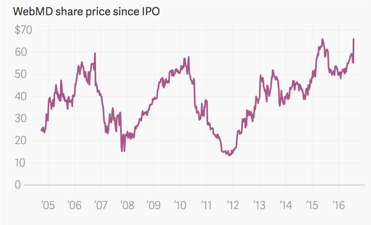 2005年9月,WebMD独立分拆IPO上市价格为每股17.5美元,公司估值为9.62亿美元。此番KKR给出的收购价格为每股66.5美元,整体估值为28亿美元,估值高出接近3倍。股价也是从2012年10月最低13美元左右一路上涨至7月24日的66.1美元。