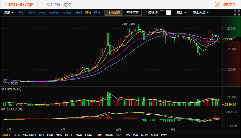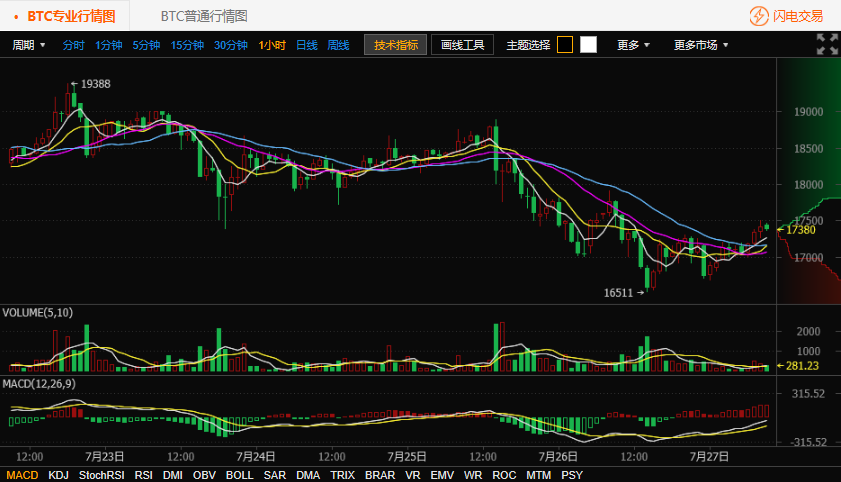 看火币网比特币行情日线图。火币网比特币昨日在16500元附近获得支撑,该位置为前期多次探底位置,且恰逢30日线支撑位,同时也是本轮高点到低点的黄金分割位,支撑力度较强,此后出现缩量反弹的格局。看火币网比特币行情小时图。今日0时因BTCE创始人在外被抓,受此利空影响火币网比特币进行二次探底,随后再次确认支撑,开启反弹之路。火币网温馨提示:投资有风险,入市需谨慎。