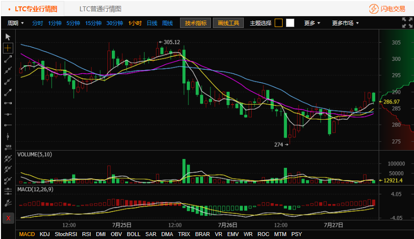 根据莱特币交易平台火币网行情显示,截至北京时间7月27日10点,莱特币价格为286.97元人民币。火币网莱特币今日开盘价格为277.5元,目前最高价格为290元,最低价格为277.5元,涨幅3.41%。