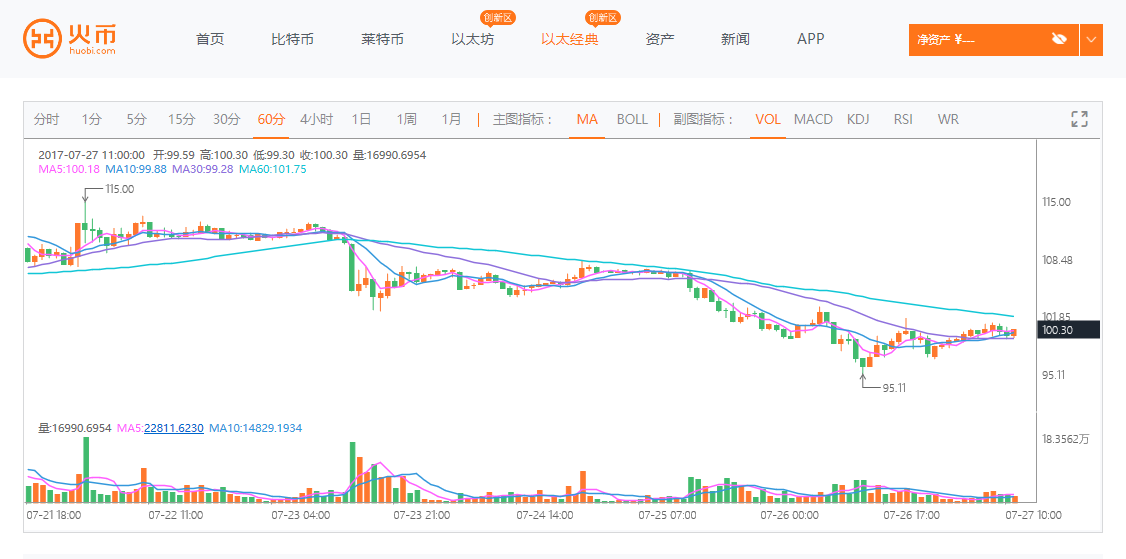 根据莱特币交易平台火币网行情显示,截至北京时间7月27日12点,以太经典价格为100.3元人民币。火币网以太经典今日开盘价格为97.12元,目前最高价格为101.07元,最低价格为96.8元,涨幅3.27%。