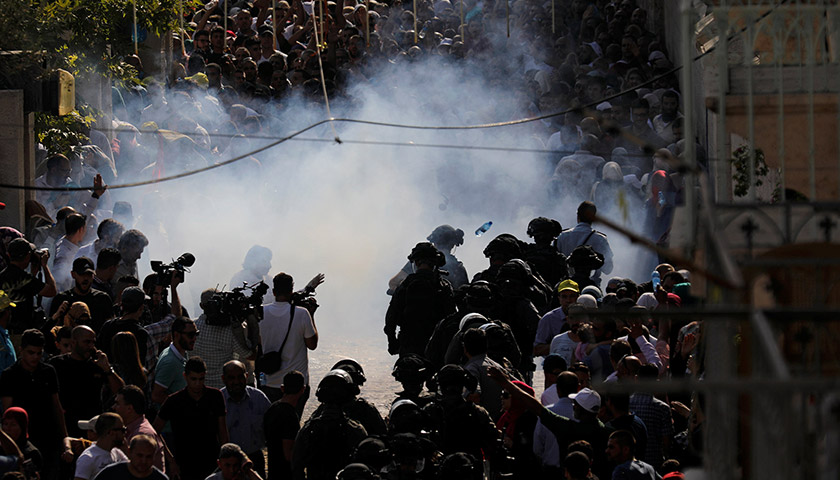 据CNN报道,许多朝圣者进入时还是遵守秩序,但也有民众向入口附近的以色列警察扔掷石块和水瓶,以色列警方则开始以眩晕手榴弹、烟雾弹等驱散人群,继而引发骚乱和冲突。