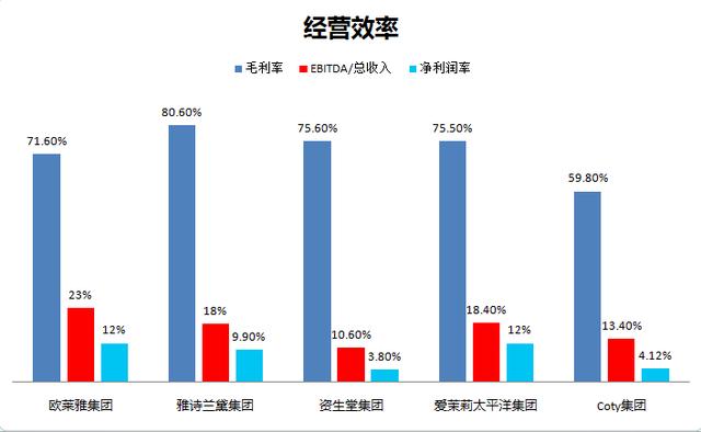 各公司护肤、彩妆、美发和香水业务销售收入、EBITDA (息税折旧摊销前利润)、净利润和经营效率的对比: