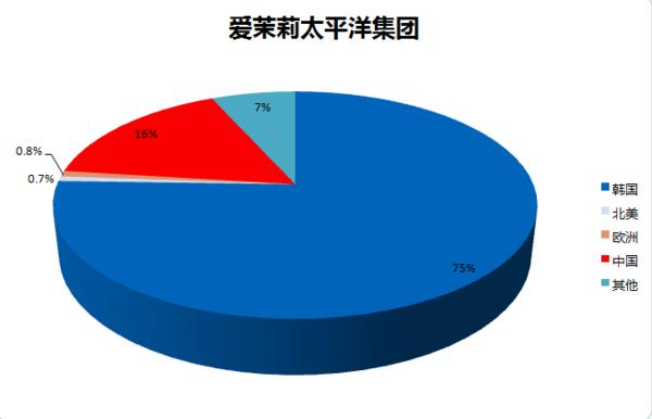 爱茉莉太平洋集团 2016年销售额尽管相比 2015年的增速(同比增长 22.8%)放缓,但仍然维持强劲增长,国内市场贡献 75%。出口亚洲市场的销售额占比 24%,同比增长 38%。