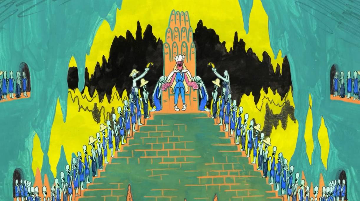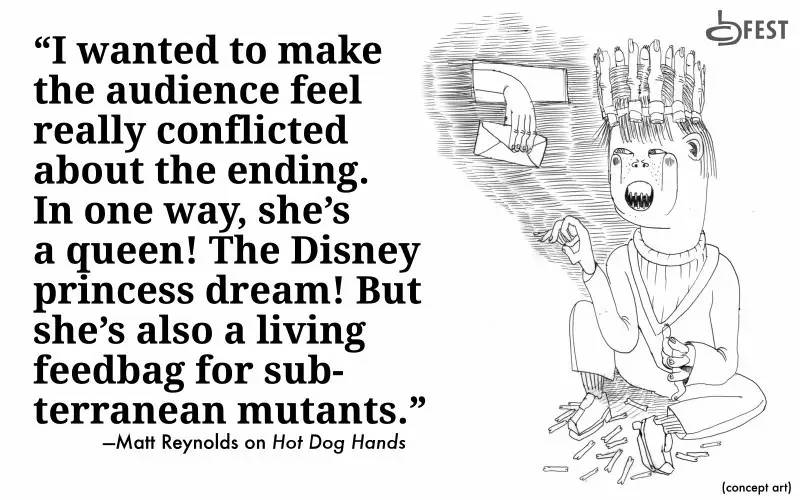 Matt Reynolds:我想用那种动画短片中惯用的经典手法,让一个本不合群的人在一个意想不到的时刻找到自己的位置,但我想让它更变态些。在我的故事里,我的主角在最后一个定格处坐在王座上,她的手臂伸得很长,像是在为无尽的饥饿喂食,这一刻我深深为之着迷。