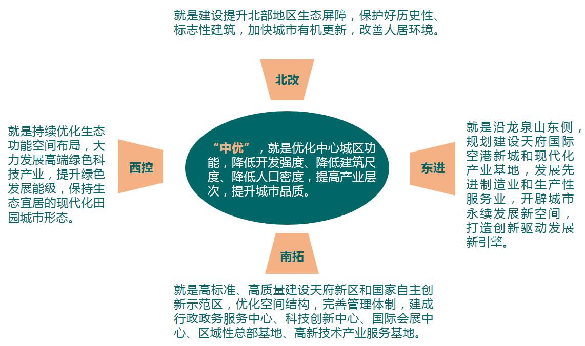 新总体规划在现有南北城市轴线基础上规划东西城市轴线,形成整个城市南北向、东西向联动发展格局,并制定了“东进、南拓、西控、北改、中优”差异化发展策略。其中,特别把实施“东进”战略作为重中之重,着眼未来50年乃至100年发展,坚持产业分区、集约开发、集群发展,推动先进制造业和生产性服务业重心东移,规划建设天府国际空港新城和现代化产业基地,开辟经济社会发展“第二主战场”。