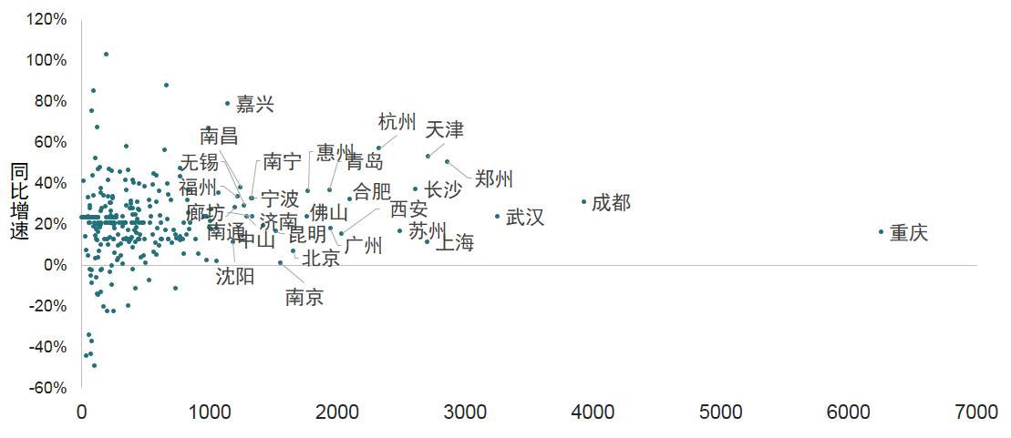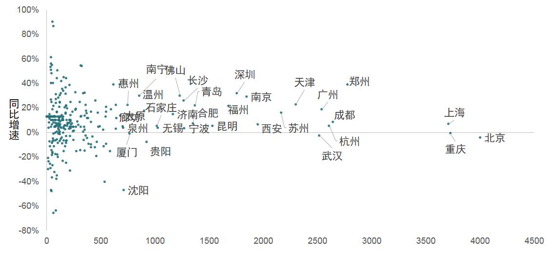 2016年,成都商品房销售面积为3819.2万平,远超全国其他城市,同比上涨26.1%,增长显著。由此表明,成都房地产投资和需求旺盛,且不断增大,市场处于一个健康的、较强的发展阶段。一线城市中,北京、深圳土地稀缺导致供应规模的大幅下降,销售面积增速放缓,北京销售面积同比仅增长6.7%,深圳销售面积甚至出现负增长,为-11.5%。西部地区除省会城市以外的三四线城市由于经济和人口规模较小,房地产市场需求较为有限,销售面积也相对较小。