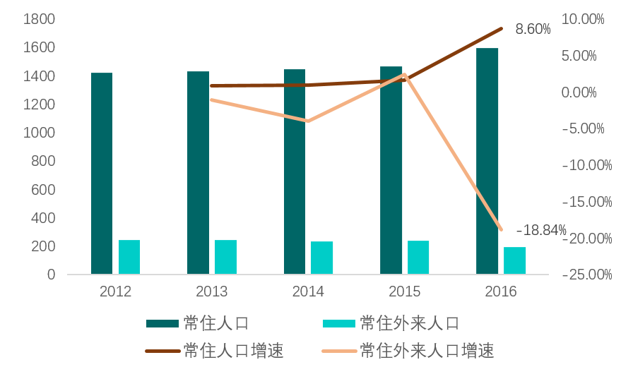 据统计局数据显示,2016年成都市常住人口与户籍人口均大幅增加,常住人口增速高达8.6%,远远高于前5年的水平,也高于其他国家中心城市。但成都市外来常住人口数量却呈下降趋势,2016年下降幅度更是达到了18.85%。
