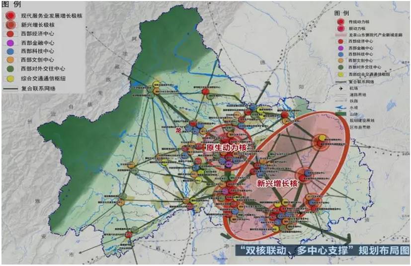 为优化城市空间结构,重塑城市经济地理,成都新一轮城市总体规划将城市布局由原来的“两山夹一城”转变为“一山连两翼”,龙泉山由原来的生态屏障转变为城市绿心。同时,将国家中心城市“五中心一枢纽”的功能在全域统筹布局,构建“双核联动、多中心支撑”的功能体系,推动城市由单极发展向双城时代迈进,由圈层式发展向多中心支撑迈进,由同质化竞争向错位发展迈进。
