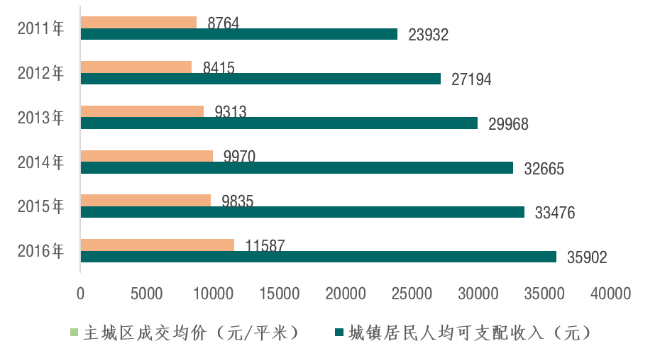 从2011-2016年成都主城区商品房均价和城镇居民人均可支配收入统计可以看出,成都主城区房价收入比整体呈平稳下降趋势,且较国内热点城市水平相对偏低。由此表明,目前成都楼市整体健康稳健,主城区的房价与其他热点城市相比较为正常。从人均收入来看,成都虽然比沿海城市少,但平均房价的差别则较大,因此成都的房价是与居民的收入相适应的。