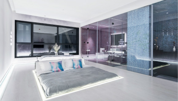 其中光·迷离崇尚自然、空旷、纯净,位于房间中央的一张双人床被嵌入地板内部,颇有“天为被、地为床”之意境。有了这样的设计,情侣们再也不用担心“滚下床”了。