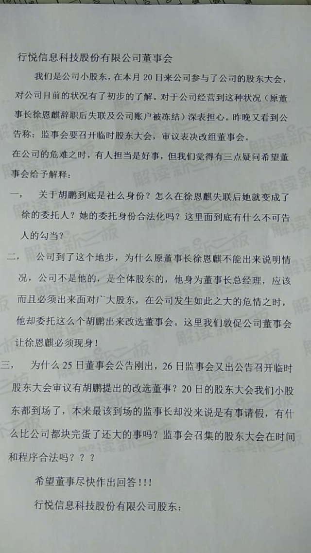 2017年7月11日,ST行悦董事会收到持股3%以上股东徐恩麒的授权委托人胡鹏发来的《关于提请改选全体董事会董事的议案》称,原有董事会的董事已经不能勤勉尽责地管理公司事务,不能胜任董事职务,提请股东大会全部改选新的董事。