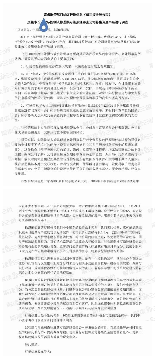 通过挂牌公司找到徐恩麒失败后,维权群将希望转向监管部门。7月21日,在临时股东大会召开的次日,ST行悦股东向证监会、全国股转公司、上海证监局寄送联名信,请求介入调查徐恩麒可能涉嫌卷走公司募集资金的事件,这封联名信有35名股东签字确认。