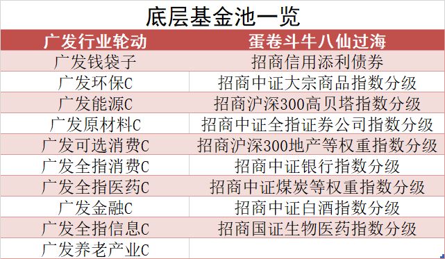 作为行业轮动策略组合,两款产品都配备了一定数量的底层基金作为投资标的,下表为广发和招商的策略基金池: