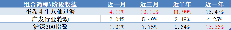 上表中标红数值为同类对比中的最高值。可以看到,近半年蛋卷斗牛八仙过海的收益率显著高于广发行业轮动,也超过了沪深300指数。