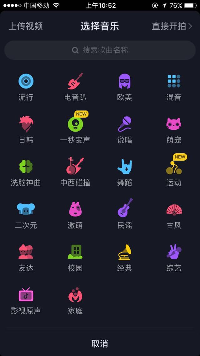 再次,在大众娱乐内容中,音乐具有广泛的受众群体,而且受市场和受众喜好的影响较大。以抖音为例,在该平台上,共提供了22个符合短视频创作的全新音乐分类,但音乐先声在亲自使用之后发现,在抖音上最受欢迎的音乐类型为电音和说唱音乐,这也与目前音乐市场上的流行风向一致。