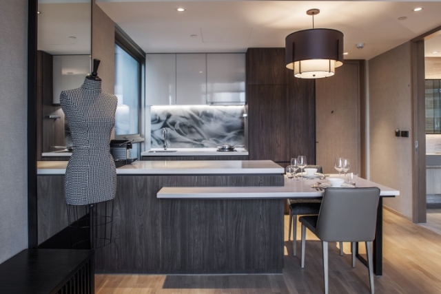 它的大门在一片密密麻麻的建筑中其实并不起眼,低调到往往会被初次到访的人错过。它藏身于两栋大楼之间,窄长的建筑表达出香港典型的垂直城市肌理。在当下这个工业和简约风格几乎被用到滥俗的时代,Residence G将两者兼具却出奇地让人舒服。在留白的空间里嵌入开放式的厨房、工作桌和迷你酒吧的一体、现代化的灯具,丰富了设计又体贴了空间的生活功能。