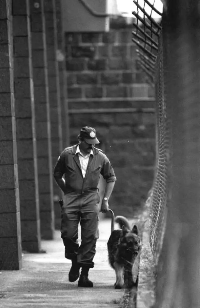 ▲有段时间彭特里奇监狱越狱事件频发,图为警犬正在巡逻