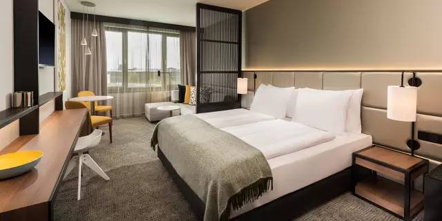 相比于彭特里奇Adina的离经叛道,德国法兰克福的这一家可以说是代表了Adina一贯的优雅舒适格调。大地色系是设计的主色调,黑、灰、棕带来知性整洁的高贵气息,分割得当的客房空间为生活起居做了有序的安排,公共空间配套餐厅、健身室为生活中的社交场景做了相应的功能补充。
