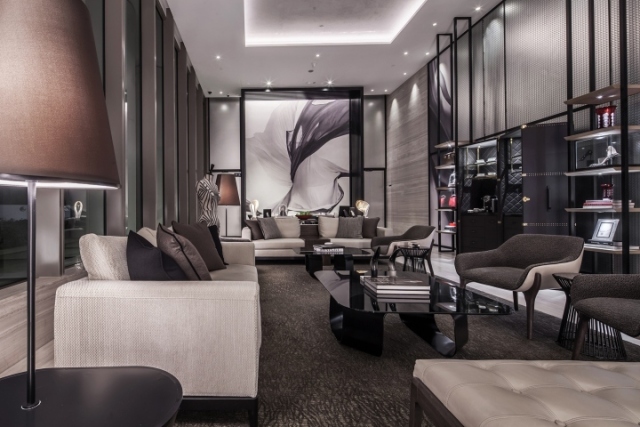 设计师运用现代化的设计语言,打造出一个适合高端客群的生活空间。大地色奠定了理性而高贵的基调,流畅的线条、随处可见和Pierre Frey物料、人形模特、大型的壁画呈现出流动而丰富的设计色彩。简单却不单调,拥有着历经岁月洗礼也不会过时的设计品格。