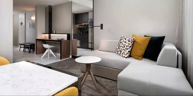 同时又强调设计中的人文因素,譬如房间内的欢迎卡、中英文菜单、定制的枕头......Residence G还提供烹饪studio和全套的餐具;在移动端阅读设备上可免费浏览超过57000种报刊杂志;通过电视可以收看国外频道,就连洗浴备品都是国际化的Metis品牌。