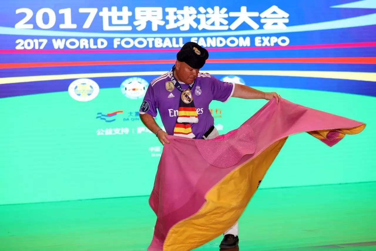 作为西班牙知名的皇马死忠,Tonin带着他的斗牛斗篷而来。据他介绍,这是劳尔、拉莫斯曾在比赛后表演斗牛舞使用的道具。接着,他在台上慷慨激昂地讲述了皇家马德里这家欧洲顶级俱乐部悠久的历史和光荣的传统。而在演讲的最后,他还带着全场球迷唱起了西班牙歌曲,并即兴上演了一段精彩的斗牛舞。