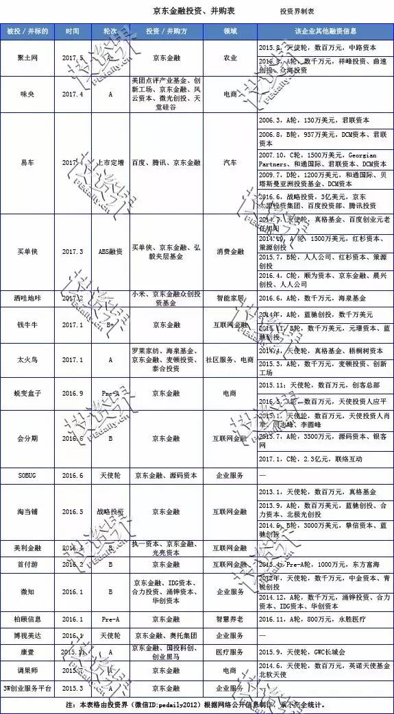 附京东金融投资、并购表: