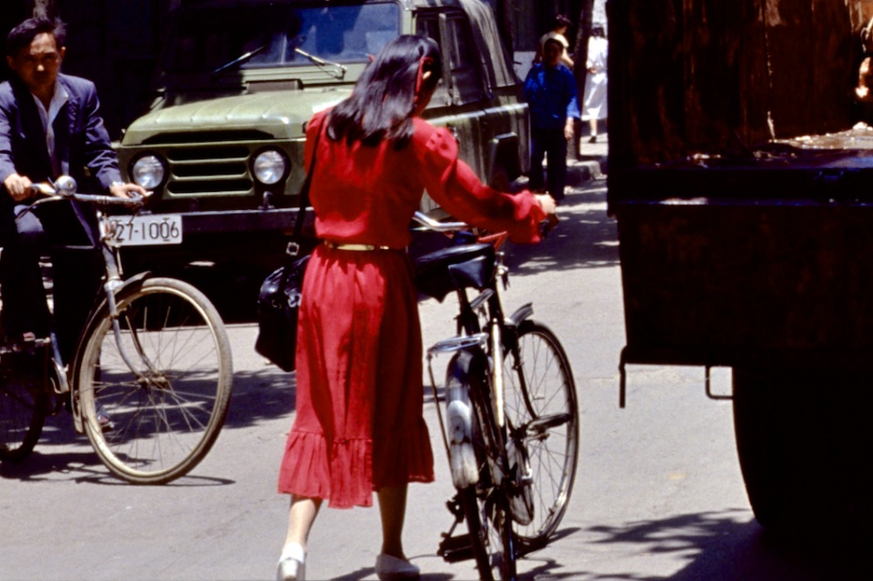 上海街头,穿红色短裙骑自行车的姑娘;拍摄于1987年夏季。【摄影:virtualcities】