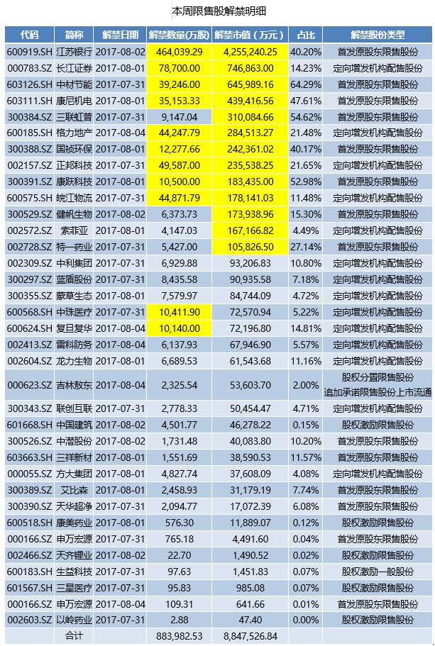 Wind资讯统计数据显示,7月31日-8月4日预计有35家公司限售股陆续解禁,合计解禁88.40亿股。按7月28日收盘价计算,本周解禁市值合计884.75亿元,其中,江苏银行占去近半。