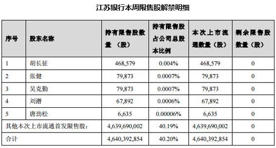 江苏银行是本周,亦是8月份解禁规模最大的上市公司。根据公告,公司8月2日将有46.2亿股限售股上市流通,占总股本比例40.20%,市值约425.52亿元,为首发限售股上市流通。